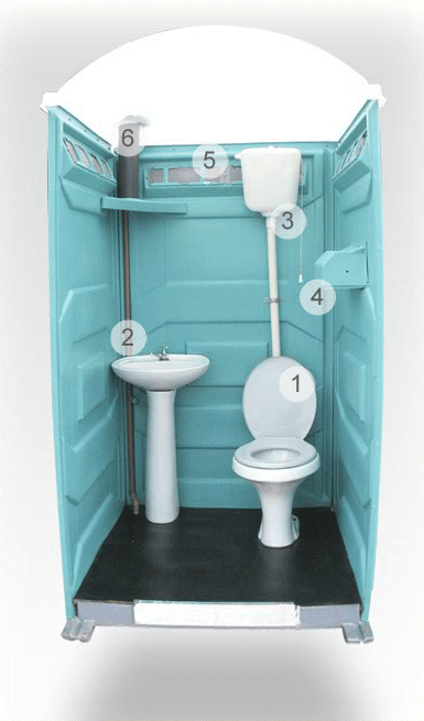 O banheiro convencional portátil, possui pia de louça, vaso sanitário de louça com assento e tampa, porta papel higiênico, teto translúcido e piso antiderrapante.